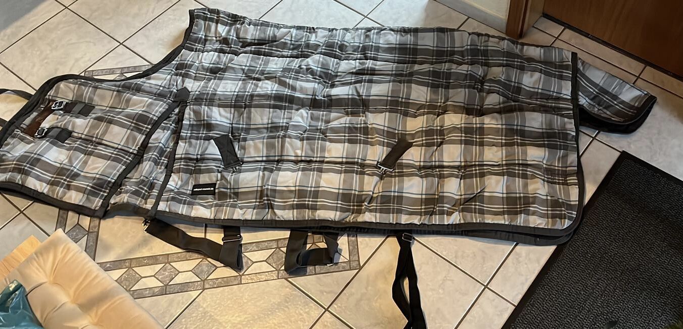 Verkaufe meine Stalldecke mit 300g Füllung. Die Decke hat eine Rückenlänge von 125 cm.