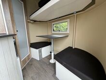· Wohnabteil mit Dusche, Staufächern, Kühlschrank, Mikrowelle, Spülbecken Tisch mit 2 Sitzplätzen zum Stockbett umbaubar, Ausstellfenster
