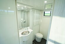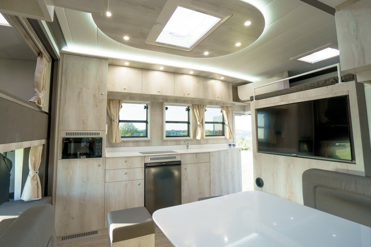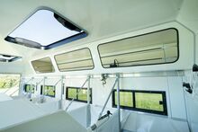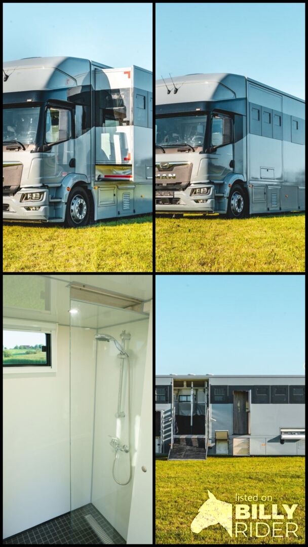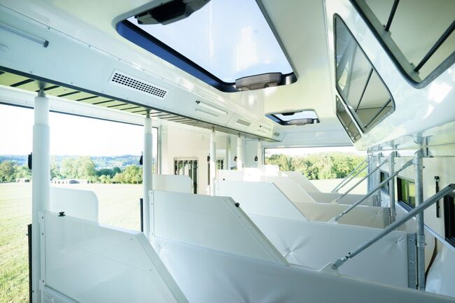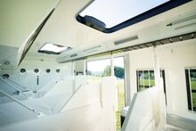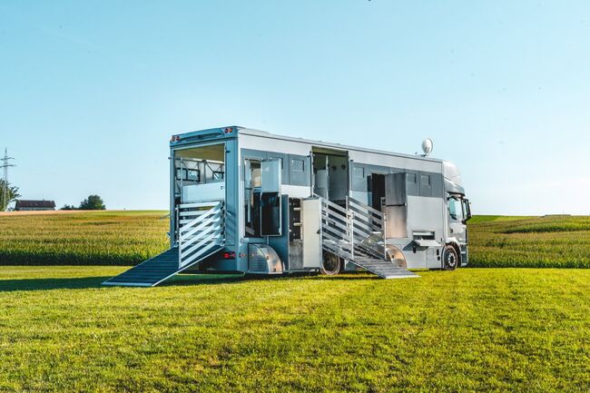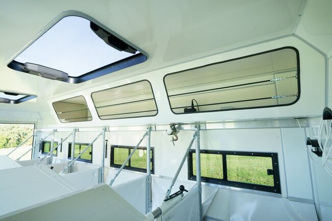 4-5 Pferdestellplätze, Heck- und Seitenrampe mit Rampenbegrenzer, Videoüberwachung, Dachluken, Elektrolüfter, Nachtfahrbeleuchtung, Seilwinde, versetzbare gepolsterte Trennwände mit klappbarem Beißschutz, Ausstellfenster, Deckenablage über den Pferdekruppen