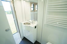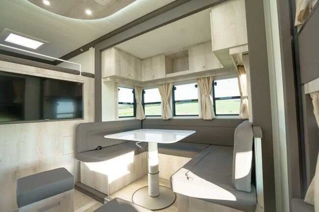 Neufahrzeug Wohnung mit Pop-Out, darin Sitzgruppe mit Tisch zum Schlafplatz umbaubar, Bett über dem Bad, Bett über dem Fahrerhaus im Topsleeper, insgesamt 5-6 Schlafplätze, Ceranfeld, Mikrowelle/ Backofen, Kühlschrank, Schränke und Hängeschränke, Bad mit Dusche, Häcksler Toilette, Waschbecken sowie Schränken