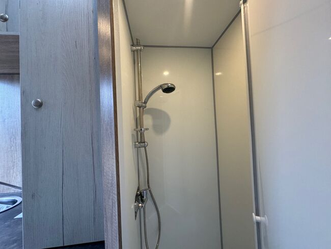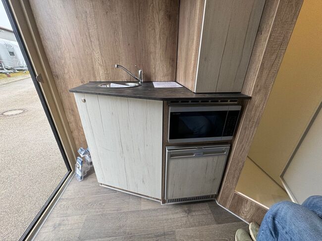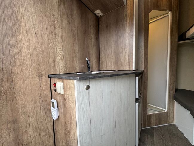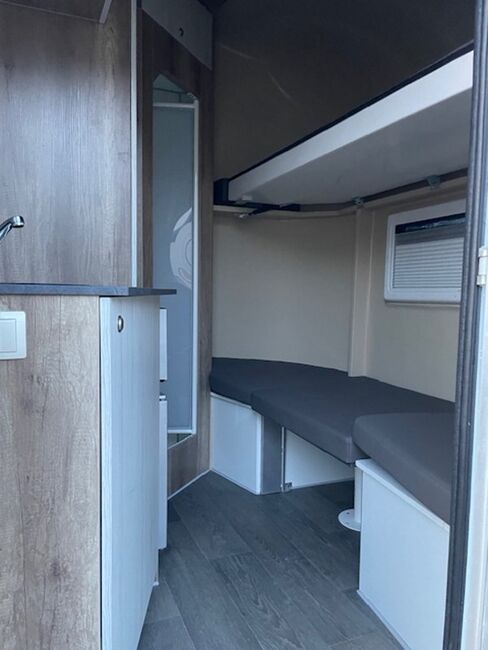 Wohnabteil mit Dusche, 2 Sitzplätzen und Tisch zum Stockbett umbaubar, Küchenzeile mit Spüle, Microwelle und Kühlschrank, viele Staumöglichkeiten.