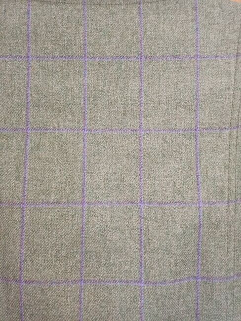 Diese Really Wild Damenweste wurde noch nie getragen. Der Tweed ist hellgrün mit einer hellvioletten Schraffur.