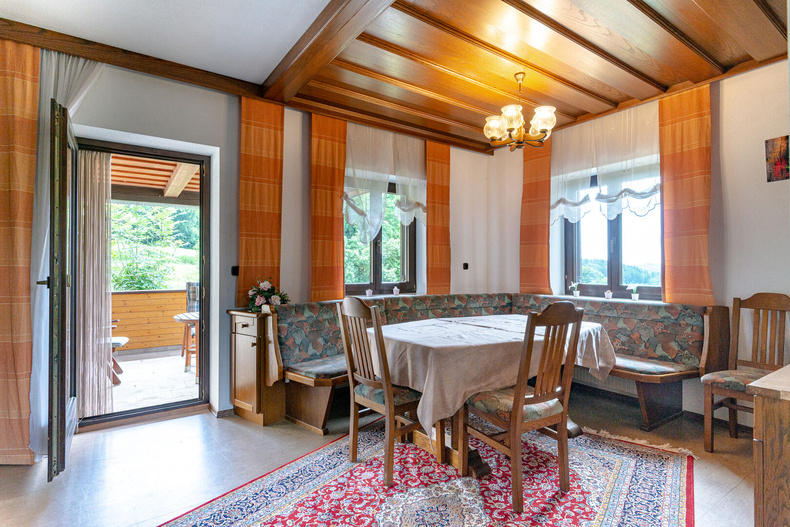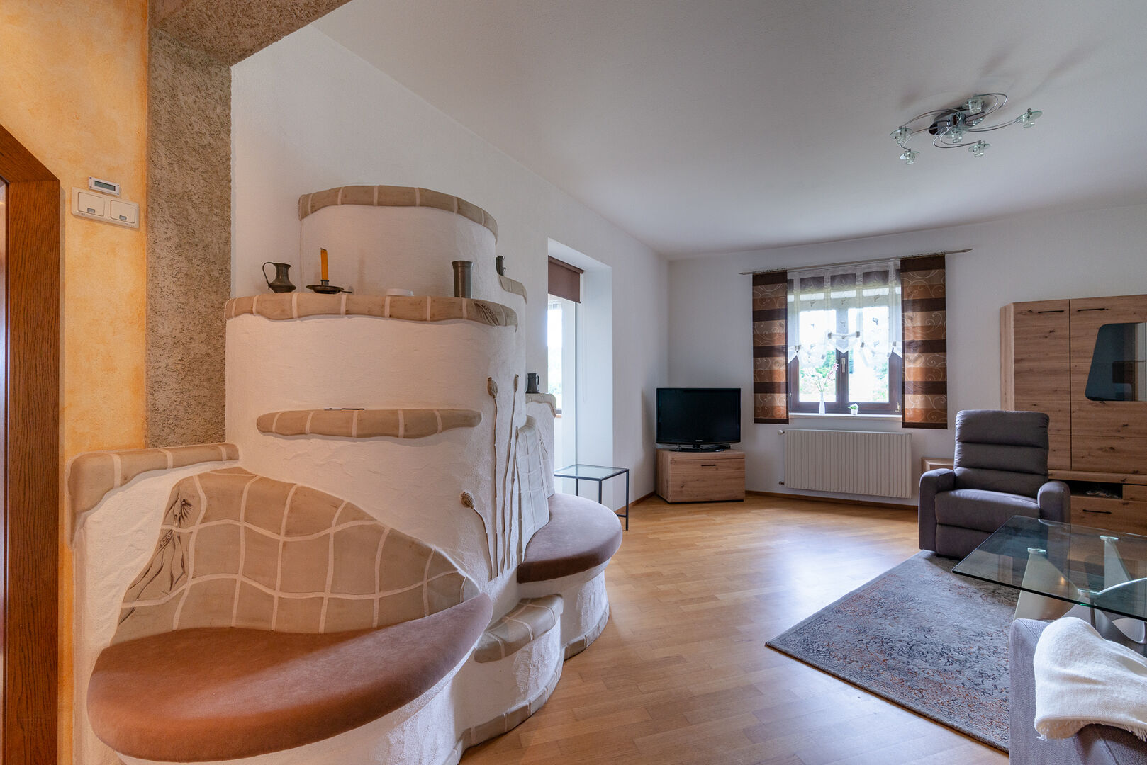 🔸 Wohnzimmer, 3 Schlafzimmer, offene Wohnküche mit Sitzecke, Badezimmer, Wirtschaftsraum, überdachte Terrasse, Kachelofen, Zentralheizung (Pellets, Holz), Warmwasser Solaranlage, 1 Garagenplatz + 3 Parkplätze