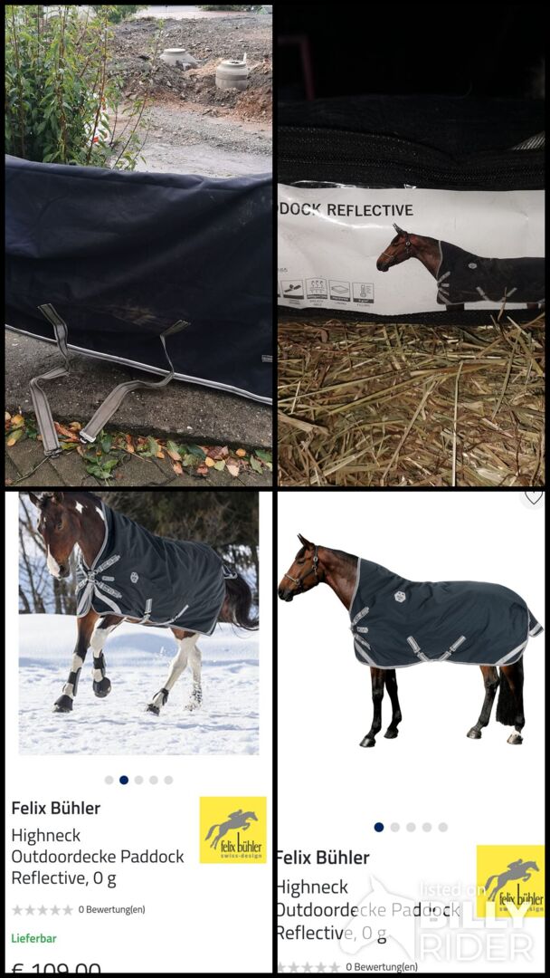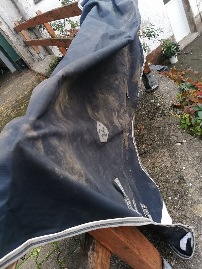 Die Decke hat mein Pferd eine Nacht getragen. Daher ist sie auch etwas dreckig geworden. Sie ist absolut dicht und hat Dauerregen ausgehalten. Leider sitzt sie bei meinem (mit viel wälzen und spielen) doch nicht so ideal. Vermutlich ist er doch zu schmal für die Decke. Daher kommt sie weg.