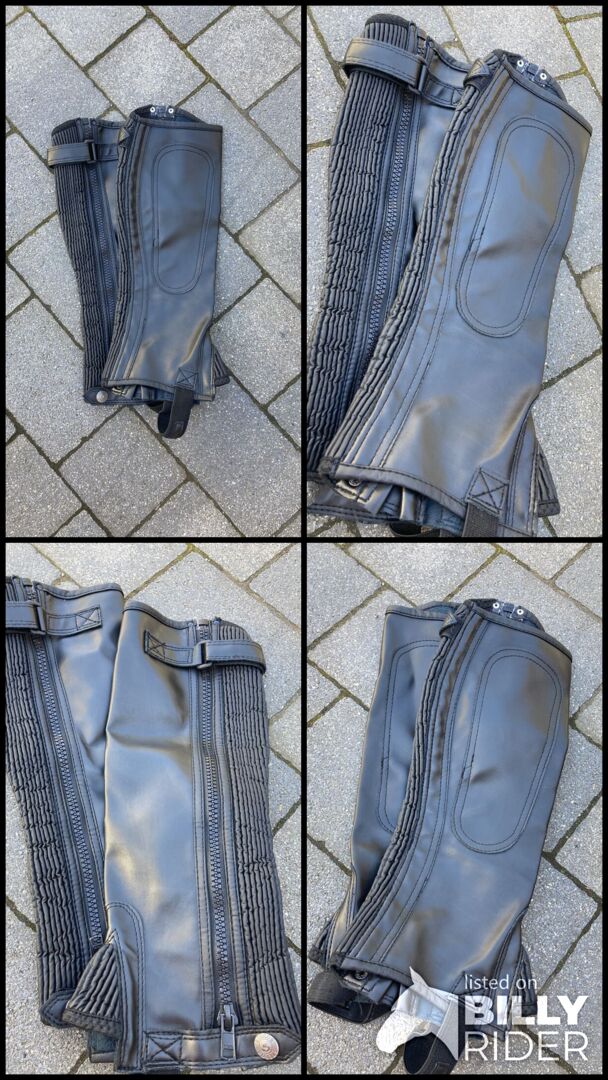 Schwarze aus Kunstleder bestehende Reitchaps zu verkaufen . Sie entsprechen der Größe M und passen sich dem Bein gut an.