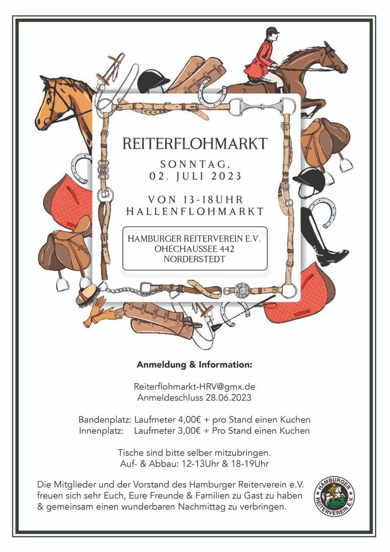 Liebe Pferdefreunde! Dieses Jahr ist es endlich so weit, wir dürfen Euch zu unserem 1.Reiterflohmarkt im Hamburger Reiterverein begrüßen! Am Sonntag den 02.Juli öffnen wir die Pforten unserer Halle auch ohne Pferd unterm Hintern und laden euch wind-, wetter und sonnengeschützt zum gemütlichen Bummeln, Schnäppchen machen, Verweilen und natürlich zum Verkaufen ein!