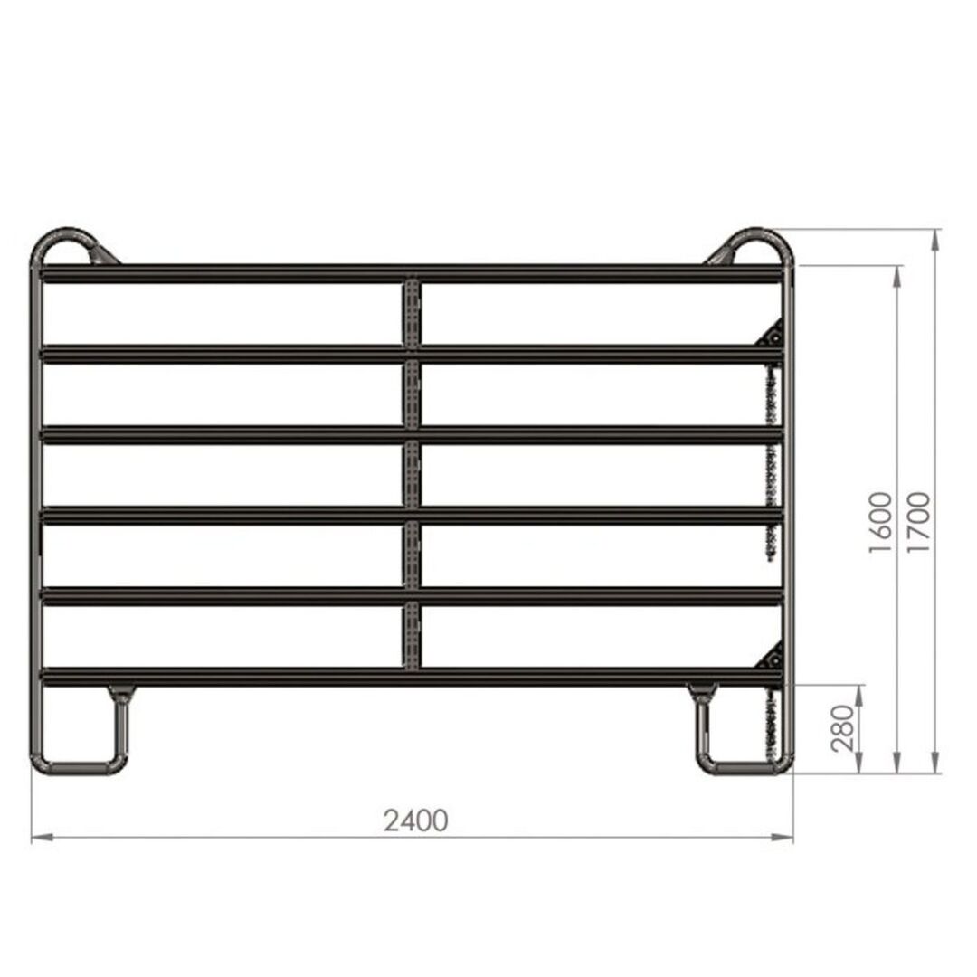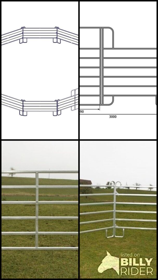 Das Roundpen (Longierzirkel) setzt sich aus einem Panel- mit 6 Streben zusammen und einem Panel mit Tor. Wie viele Panel-6 verwendet werden, hängt vom Durchmesser des geplanten Roundpens ab. Die Panels sind 3m breit und 1,70m hoch.