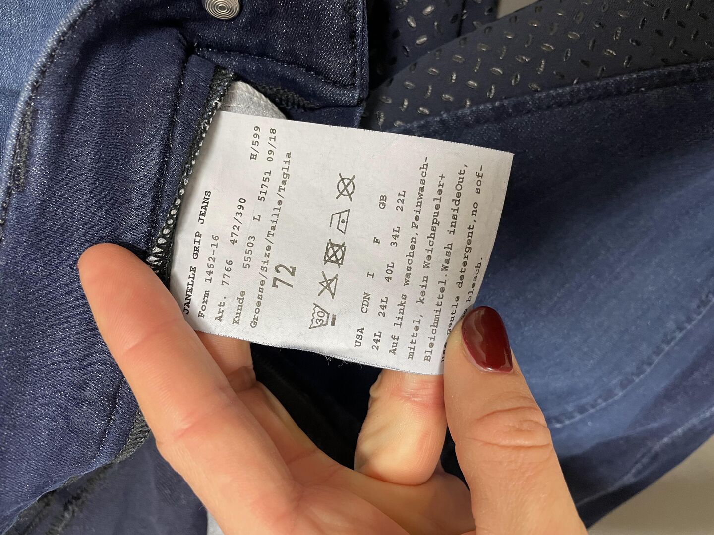 Sehr selten getragen, ohne jegliche Beschädigung, Nähte und Grip wie neu, frisch gewaschen, Jeans-Optik trotzdem sehr angenehm zu tragen, trägt nicht auf wegen Abnähern