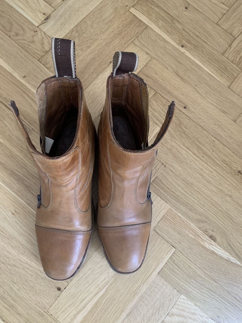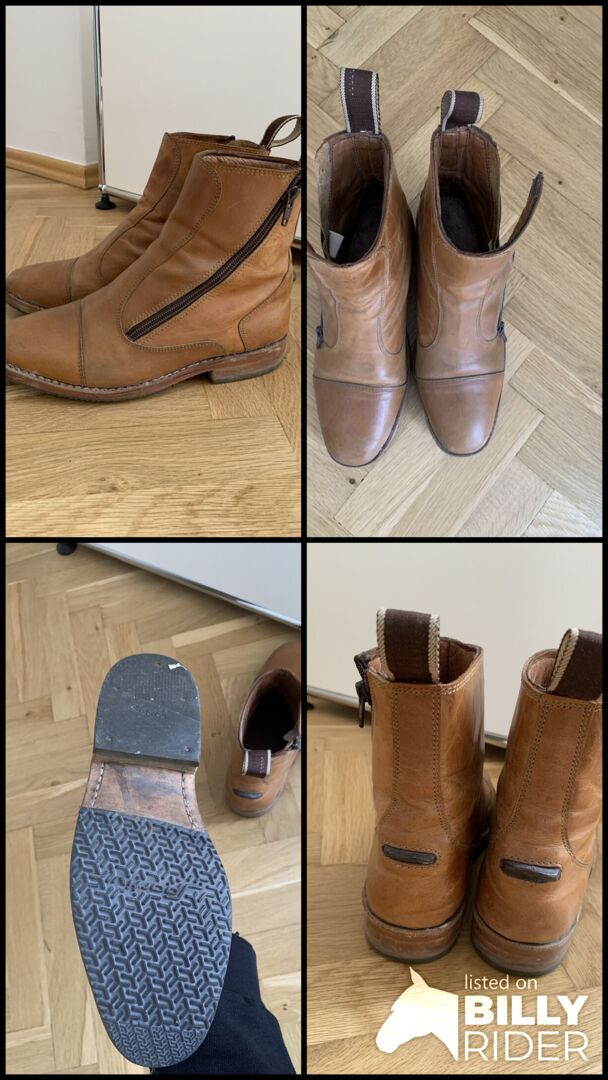 Reitstiefeletten. Auf dem Pferd habe ich sie noch nie getragen, sondern eher im normalen Alltag, weil sie so schön, mir aber leider doch etwas klein sind. Ich habe die Schuhgröße 38, ganz selten auch die 37. Der Schuh ist Größe 37, musste aber unbedingt mit. Wie das eben manchmal so ist 🤷🏼♀️