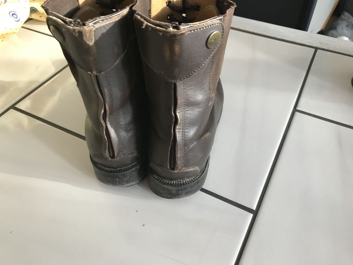 Gern getragene Reitstiefeletten, aber nichts kaputt, nur neues Absatzgummi wäre fällig. Durch Schnürung super anpassbar und der rückseitige Reißverschluss erleichtert das Anziehen.