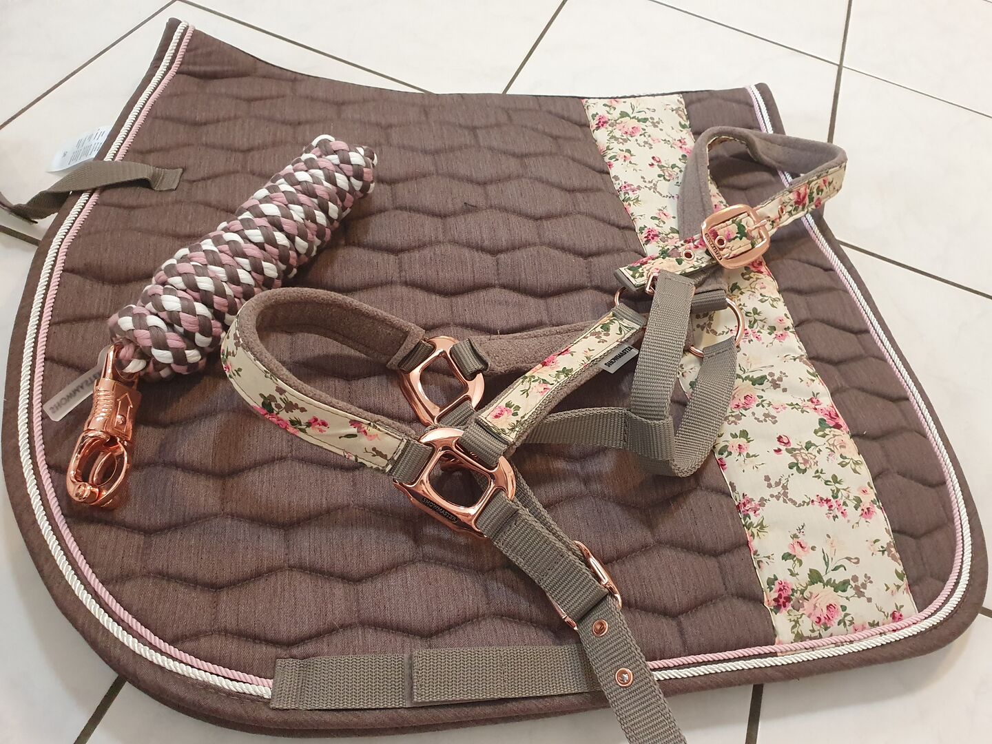 Ich biete ein unbenutztes Set bestehend aus Dressurschabracke, Strick m. Panikhaken, Halfter in WB.Die Beschläge an Halfter& Strick sind rosegoldfarben.Die Grundfarbe ist ein helles Braun, ich meine die Farbe heißt Walnuss.War nie im Stall, Etiketten wurden entfernt Privatverkauf ohne Garantie /Gewährleistung/Rücknahme.Ich verkaufe z. Festpreis.Gerne Selbstabholer/Barzahlung vor Ort.