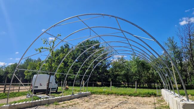 Die Konstruktion besteht aus verzinkten Stahlprofilen und wurde für den intensiven, ganzjährigen Einsatz entwickelt. Zusätzliche Aussteifungen durch Diagonalverstrebungen, Verstrebungen unter dem Dach und Seilabspannungen sorgen für hohe Stabilität und eine lange Lebensdauer. Die starke PVC-Plane mit 900 g/m² ist wetterfest, widerstandsfähig und für anspruchsvolle landwirtschaftliche Bedingungen ausgelegt. Zusätzlich bietet sie UV-Schutz 50+ und hohe Reißfestigkeit.