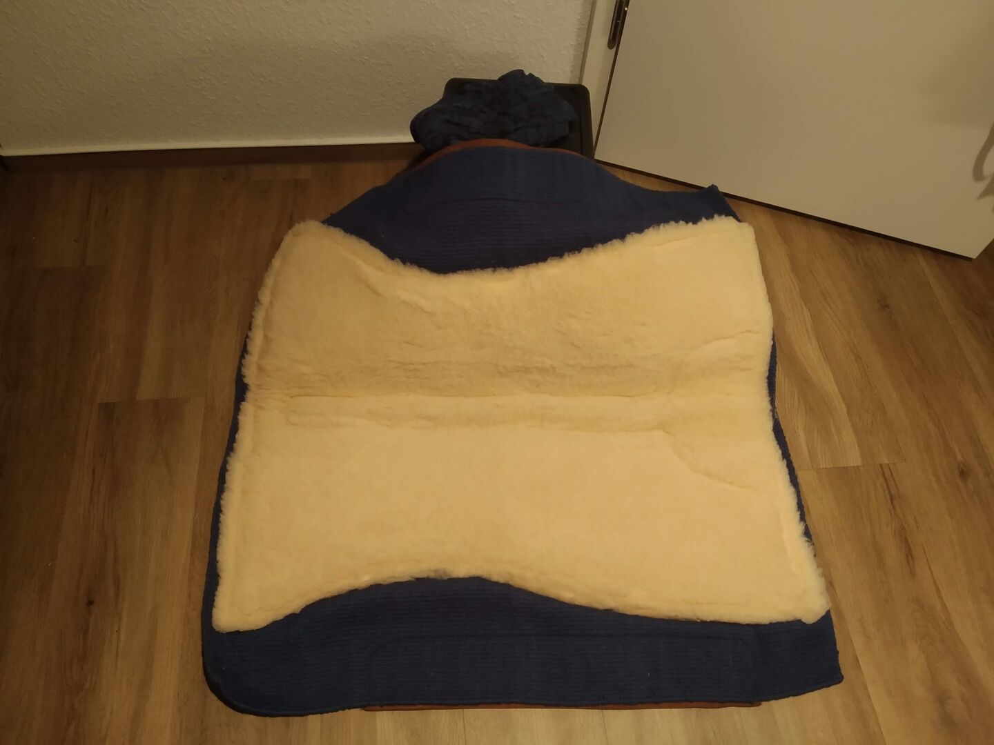 Das blaue Pad ist nagelneu und lag noch nie auf dem Pferd. Es kann sowohl als Showpad, als auch als Trainingspad genutzt werden. Es ist 85cm lang, 38 cm "hoch" und und 3 cm dick, an den Stellen, an denen es mit Fell gefüttert ist. (Sattellage).