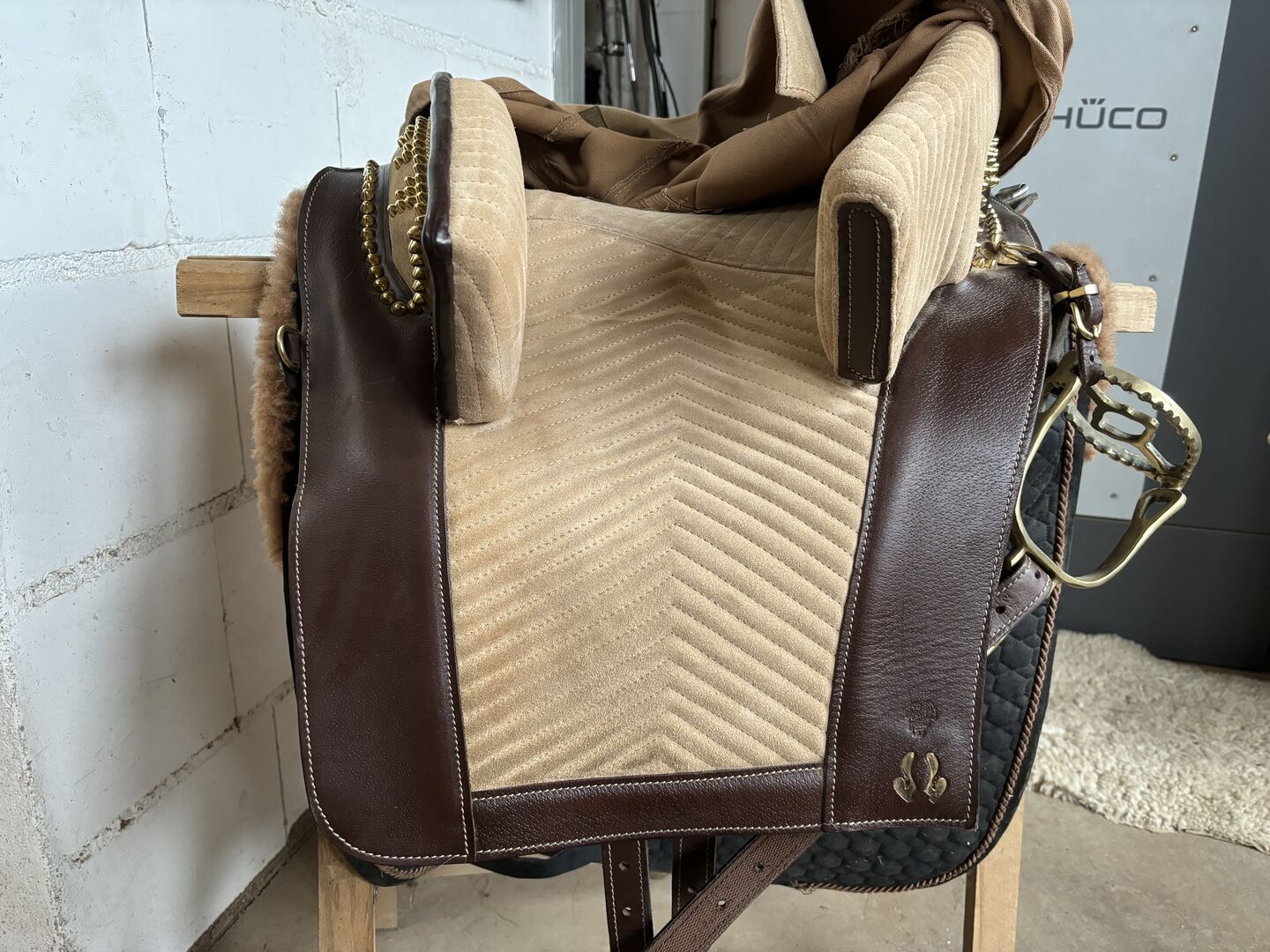 Inklusive Sattelgurt, Steigbügel und Sattelschutz.