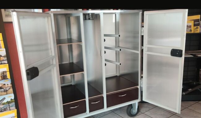 Der perfekte Sattelschrank für's Reitturnier. Durch die leichte Bauweise, und die großen Lufbereiften Lenk-und Bockrollen, ist unser Sattelschrank sehr angenehm im Händling, und leicht zu verladen.