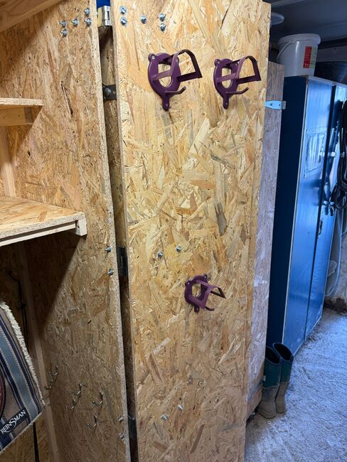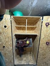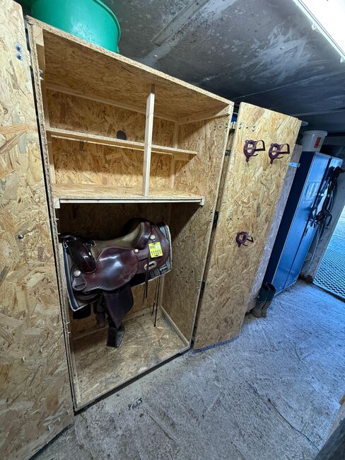 Sattelschrank zu verkaufen, da mein Pferd verstorben ist. Er ist für Westernsättel gut geeignet, Sattel ist nur zur Ansicht und nicht zu verkaufen. Die Höhe ist 1,69 m, Breite 1,00 m und Tiefe 63,4 m. Er ist auf vier Rollen mit Bremsen. Ca 1 Jahr alt, er wurde nach meinem Wunsch gebaut. Aktuell steht er noch im Stall in Langenfeld, wo man ihn dann abholen könnte. Dazu gehören noch 3 Trensenhalter, 3 Haken in der linken Türe, 1 Haken an der Aussentür links, 3 Haken innen rechts an der Seitenwand und 1 Sattelhalterung.