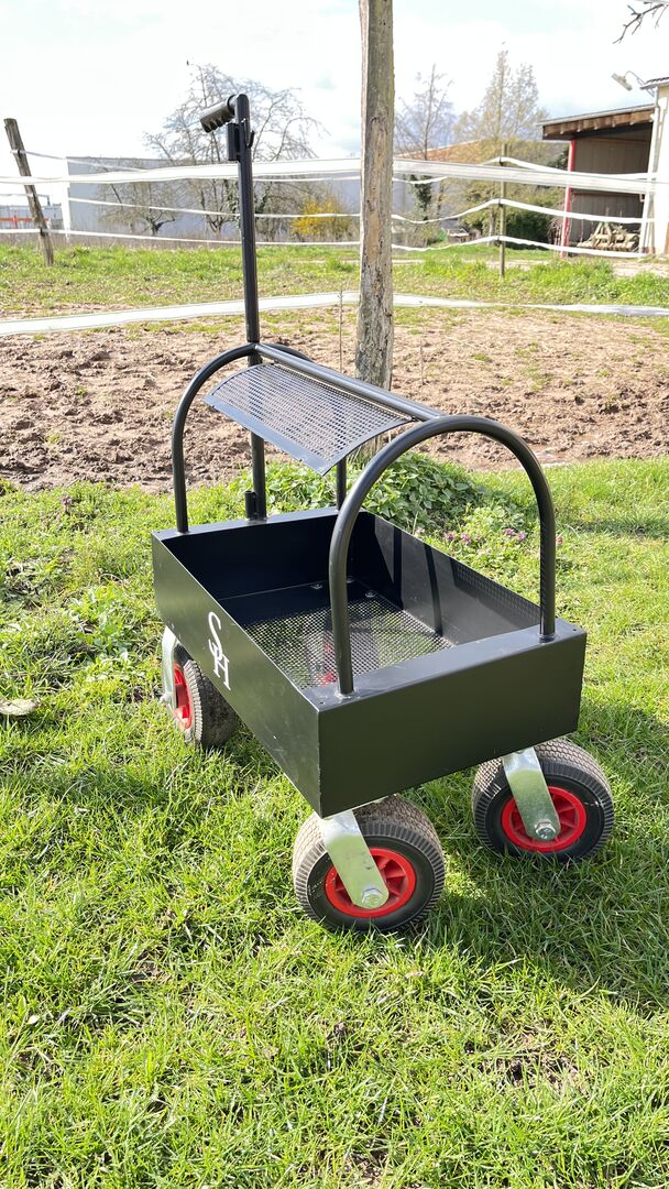 Sattelwagen mit 2 Lenkrädern Maße: 65 cm lang, 40 cm breit, 75 cm hoch Ablagefach für Utensilien (Putzzeug, Gamaschen, etc.) Für Westernsättel etwas zu niedrig
