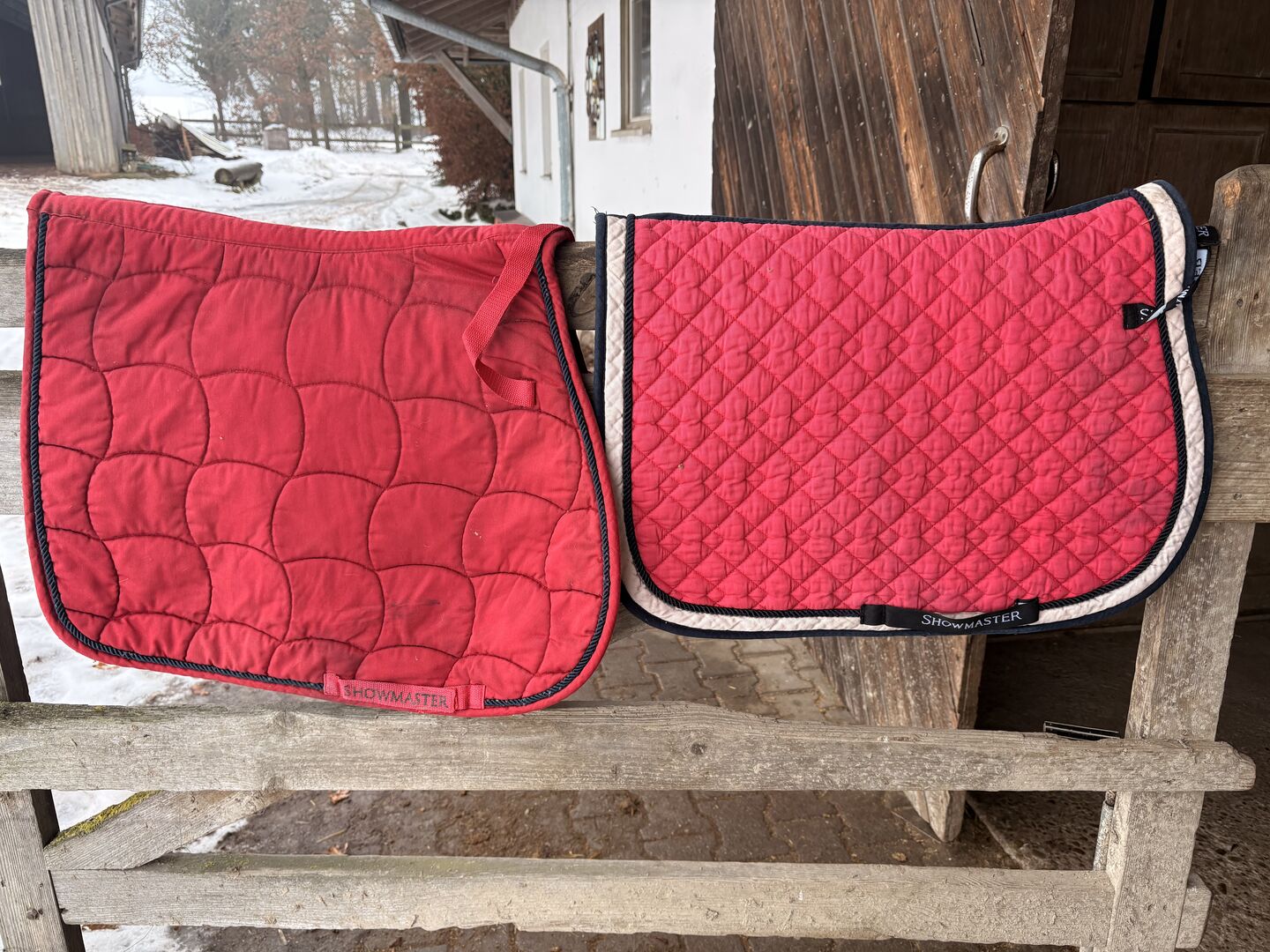 Die Schabracken sind gut erhalten und zeigen normale Gebrauchsspuren. Perfekt für den täglichen Gebrauch im Stall.