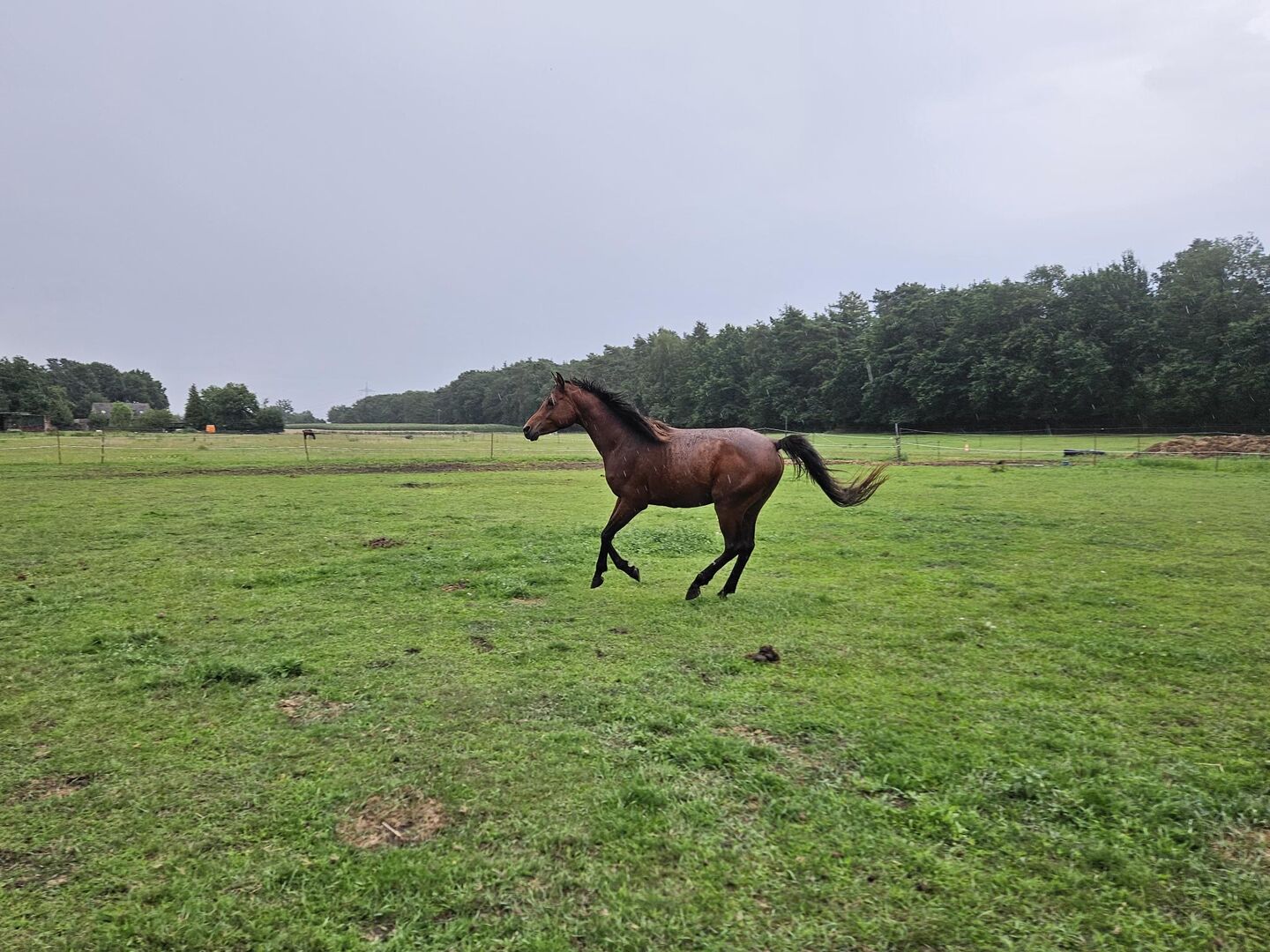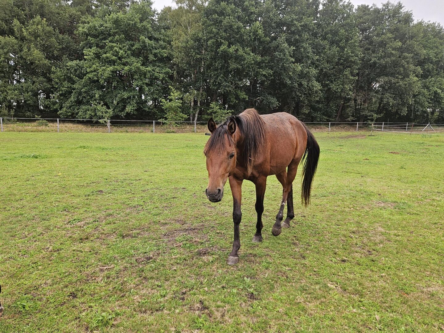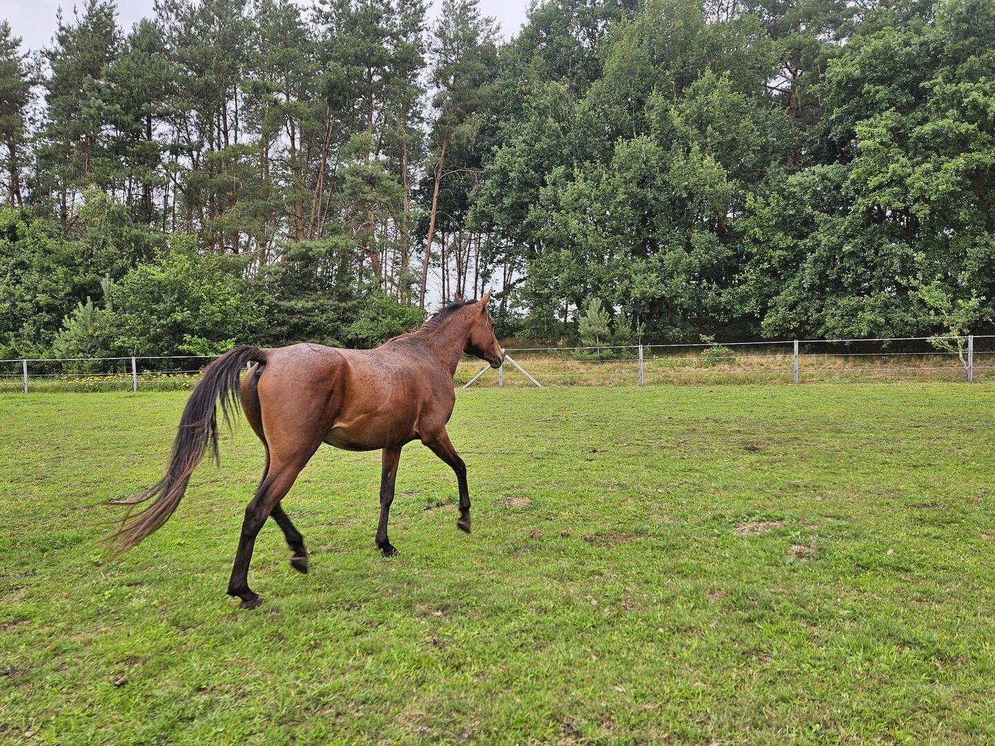 Damit ist er bereit für den weiteren Werdegang. Er hatte als Jährling eine Hautverletzung an der Hinterhand. Die wurde in der Klinik gesäubert genäht, ohne Beteiligung wichtiger Strukturen oder Sehnen. Unter den Verband sind ein paar weiße Haare entstanden. Ansonsten ist er komplett gesund aufgewachsen.