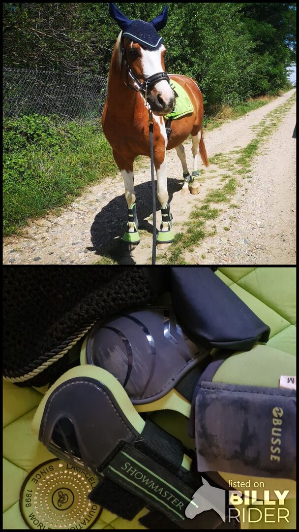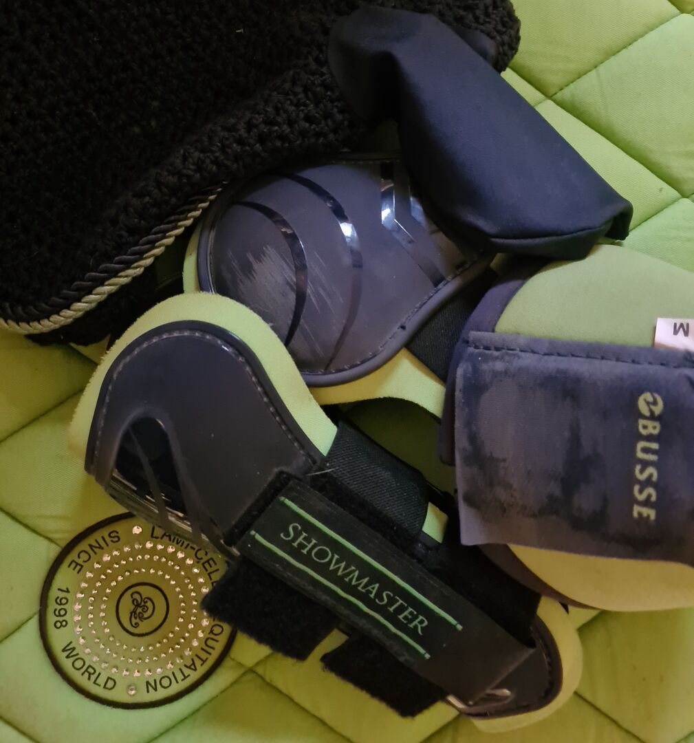 Verkaufe hier mein Set in Navy/Lime bestehend aus Hufglocken (Busse Gr.M), Gamaschen und Streichkappen (Showmaster Gr.M) einer Fliegenhaube (WB) und einer Dressur Schabracke. Lag nur 2x am Pferd, ist meinem 1,53m Paint Futzi etwas zu groß. zzgl.Vetsand (Abholung möglich)