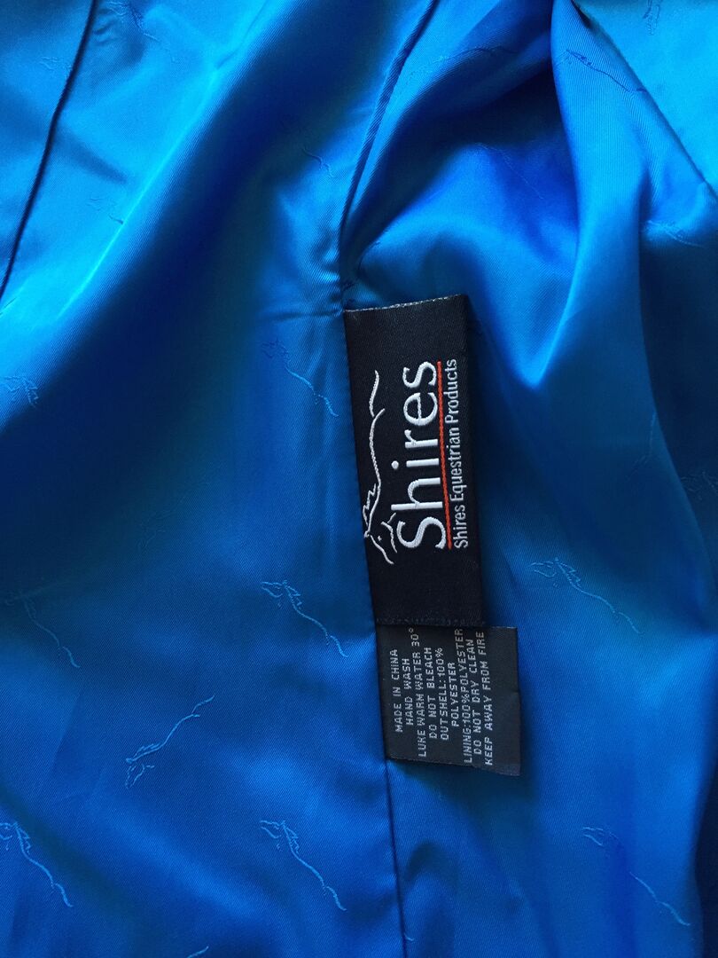 Shires Kingston Ausstellungsjacke. Größe 38, passend zu Kleidergröße 8/10. Schwarz mit blauer Verzierung. Kürzer geschnittene Jacke. Samtkragen und Samtbesatz an den Taschen. Doppelte Schlitze hinten. Hübsche Jacke.
