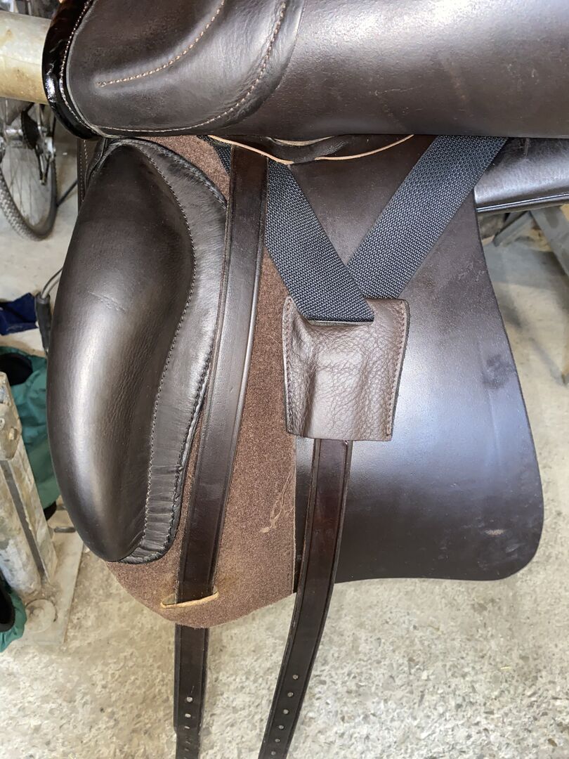 Ich biete hier einen Dressursattel der Marke Sommer inklusive Original Steigbügelriemen aber OHNE Steigbügel an. Es handelt sich um das Modell Opus 1 in der Größe 17,5 Zoll und Kammerweite 30. Der Sattel ist Dunkelbraun mit schwarzen Lacknähten und schwarzem Glitzer an den Steigbügelriemenösen und am Hinterzwiesel. Der Sattel wurde wenig benutzt, immer gut gepflegt und mit Sattelschoner gelagert. Lediglich am Sattelblatt sind minimale Gebrauchsspuren durch das Reiben der Steigbügelriemen zu sehen (siehe Bilder). Der Sattel hat einen halb tiefen Sitz, Klettpauschen, sehr weiche Kissen und einen flexiblen Baum, wodurch er sich sehr gut anpassen lässt. Ich verkaufe ihn nur, da ich auf einen Westernsattel umsteigen möchte.
