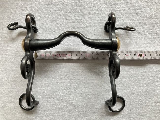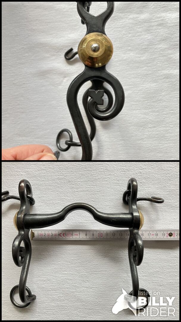 Spanische S-Kandare, Alta Escuela von Roldan, schwarz brüniert mit festen Anzügen und einer kleinen Zungenfreiheit. Mit Kinnkettenhaken. Ohne Kinnkette. Breite 13,5cm. Gebissdicke 11mm in der Mitte, an den Schenkeln 20mm. Länge der Anzüge 10cm. Es ist traditionell gefertigt d.h. rostet. Es wird empfohlen das Gebiss ab und an mit z.B. etwas Olivenöl einzureiben, damit sie dunkel bleibt.