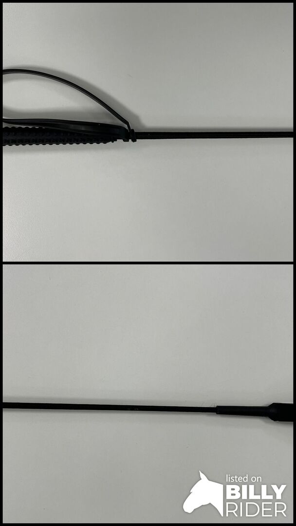 Springgerte in schwarz mit schmalen Schlag, genopptem Handgriff und mit separater Handschlaufe aus Kunststoff.