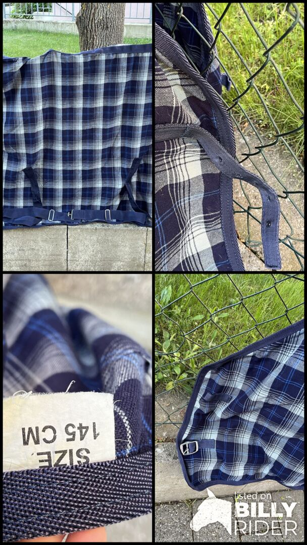 Blau karierte Stalldecke, 145cm, vorne fehlen leider 1 Schnalle und 1 Strippe, kann man über Kreuz zu machen, 1 Bauchgurt hängen Fäden weg und löst sich bisschen, kann man jedoch wieder hin nähen