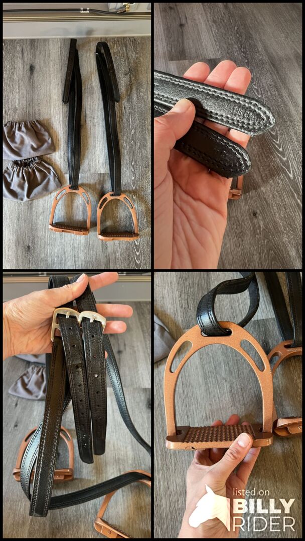 Verkaufe hier ein Steigbügel Set welches besteht aus den Steigbügeln selbst, Steigbügelriemen in 155cm und passenden Schonern um den Sattel vor zerkratzen zu schützen. Da ich nur noch einen Sattel besitze, sind die Steigbügel übrig und werden nicht mehr benötigt. Verkauf erfolgt gerne als Set, einzeln auch möglich, dazu bitte einmal die Preise erfragen.