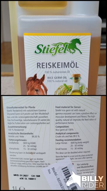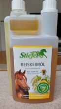 Angebrochene Flasche Reiskeimöl für Pferde von Stiefel. Es wurden ca. 2 Portionen a 30 ml entnommen, die Flasche ist also noch gut gefüllt. Wurde kühl und dunkel gelagert. Mindesthaltbarkeit bis Januar 2027.