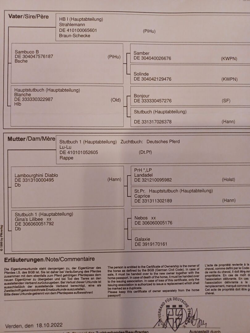 Saphira ist am 25.04.22 geboren Sie stammt vom strahlemann ab. Ihre Mutter ist ein deutsches sportpferd ( keine Turniererfahrung) . Saphira hat volle Papiere vom zfdp. Sie hat gute gga. Lernt bei uns das fohlen abc. Ist regelmäßig beim Schmied der hufstand ist korrekt. Sie lernt auch schon das Anhänger fahren. Steht in einer gemischten Herde und ist vom Charakter eher ruhig.