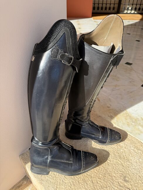 Maßgeschneiderte Dressurstiefel. Dunkles marineblaues Leder mit schwarzem Seude und Haifischhautbesatz. Gehärtetes Außen Kalb 35cm Innenbein Boden bis oben 45cm