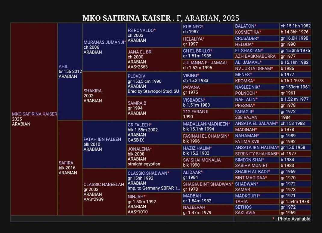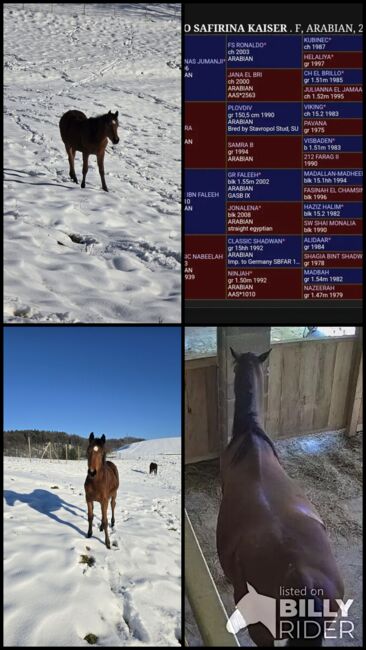 Sie hat Abstammungspapiere: Die Mutterstute Safira ist rein ägyptisch gezogen und hat ordentlich GO - frei sowie unterm Sattel. Der Vater Ahil ist seit Jahren in unserem Besitz, ist ein tolles Hand- und Reitpferd und kann sogar einige Tricks. Er ist der Enkel von unserem ersten Pferd Samra B. Da ich selbst keine Interessen hatte jemals Wettkämpfe zu bestreiten, wurden meine Pferde nie irgendwelchen Turnieren ausgesetzt. Sie kennen jedoch Ausdauer, Springen und feinste Anordnungen durch Gewichts- und Schenkelverlagerungen draußen am Feld und in der Manege (hier auch ohne Sattel/Zaumzeug/Halfter).