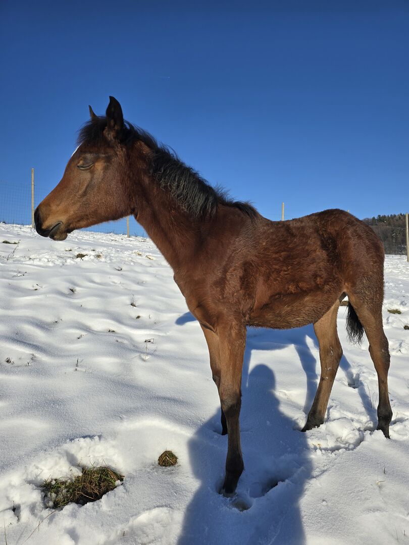 Safirina lebt zurzeit mit ihren Eltern und einem weiteren Pferd im Offenstall auf einem kleinen Bauernhof.