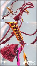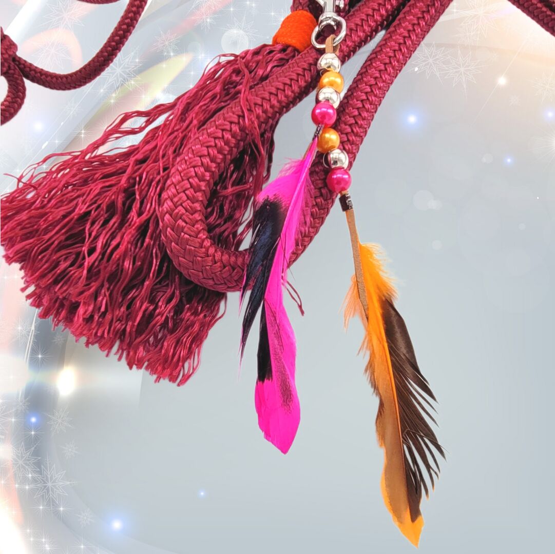 Auffallendes Set aus dem Hause Freespirit Horse Art in Bordeaux, Orange und Ocker Set bestehend aus Knotenhalfter mit verziertem Nasenstück und Halsstrick. Dazu 2 passend Federclips. Halfter 6 mm dick, Halsstrick 12 mm dick