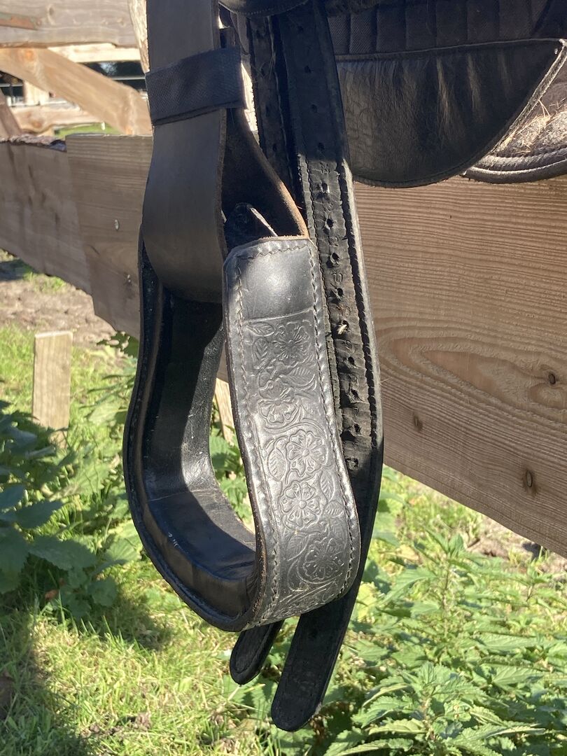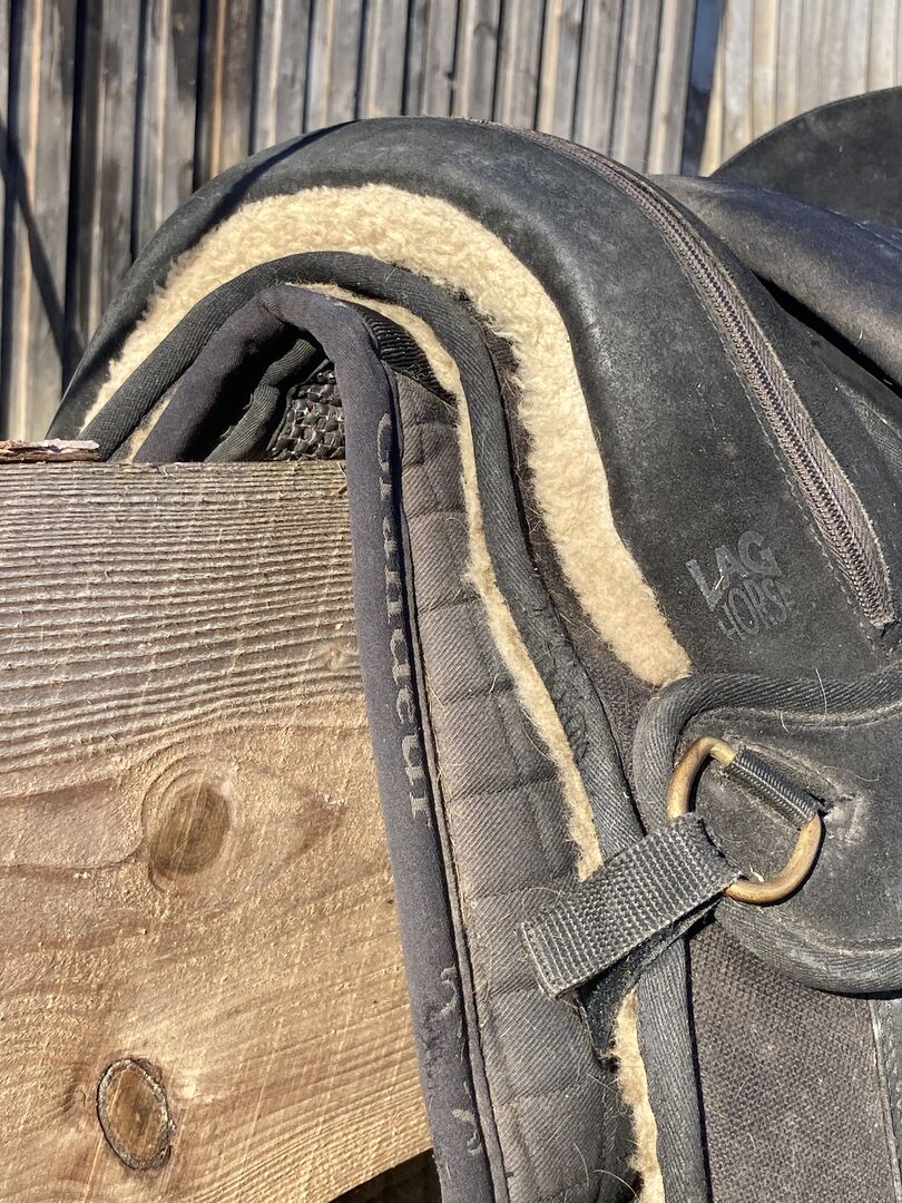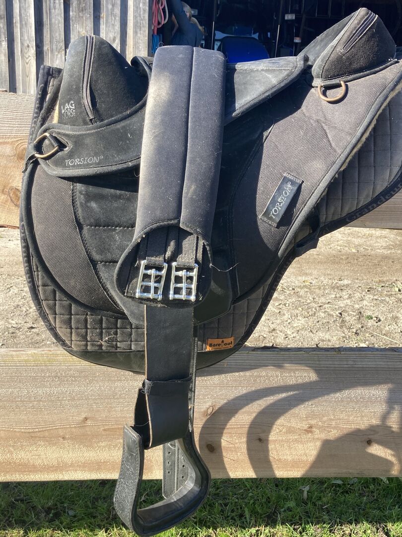 Schwarzer baumloser Sattel der Marke Torsion. Die Unterseite ist aus Fell. Die Sitzfläche ist aus Wildleder und bietet dadurch einen guten Sitz. Fender und Bügel sind auch dabei.