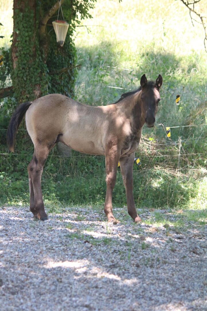 Direkt vom Züchter wird dieser bildhübsche, ausdrucksstarke Quarter Horse Hengstjährling in ein neues Zuhause bei lieben Pferdemenschen abgegeben. Er ist 4.23 geboren und wird ein geschätztes Endmaß zwischen 150 -155 cm bekommen. Dunits Braveheart aka Bubi ist ein neugieriger, cooler und verspielter Jährling mit einem super aufgeschlossenem Wesen. Er weiß sich zu präsentieren und zeigt ein super Gangvermögen. Bubi steht korrekt, ist gut gebaut und harmonisch bemuskelt. 5-Panel n/n und reinerbig schwarz. Der Jährling kann aber nicht nur mit seinem Äußeren und seinem Charakter punkten, sondern auch seine Abstammung ist top. Sein Vater ist Hesa Blackberry King, ein Sohn von Mr King Raffles aus einer Spook N Tari Mutter. Hesa Blackberry King hat bereits erfolgreiche Nachzucht. Die Mutter von Bubi ist eine Enkelin von Hollywood Dun It. Der Hübsche verspricht ein toller Partner für den Allround Sport und ebenso auch ein zuverlässiger Freizeitbegleiter zu werden.