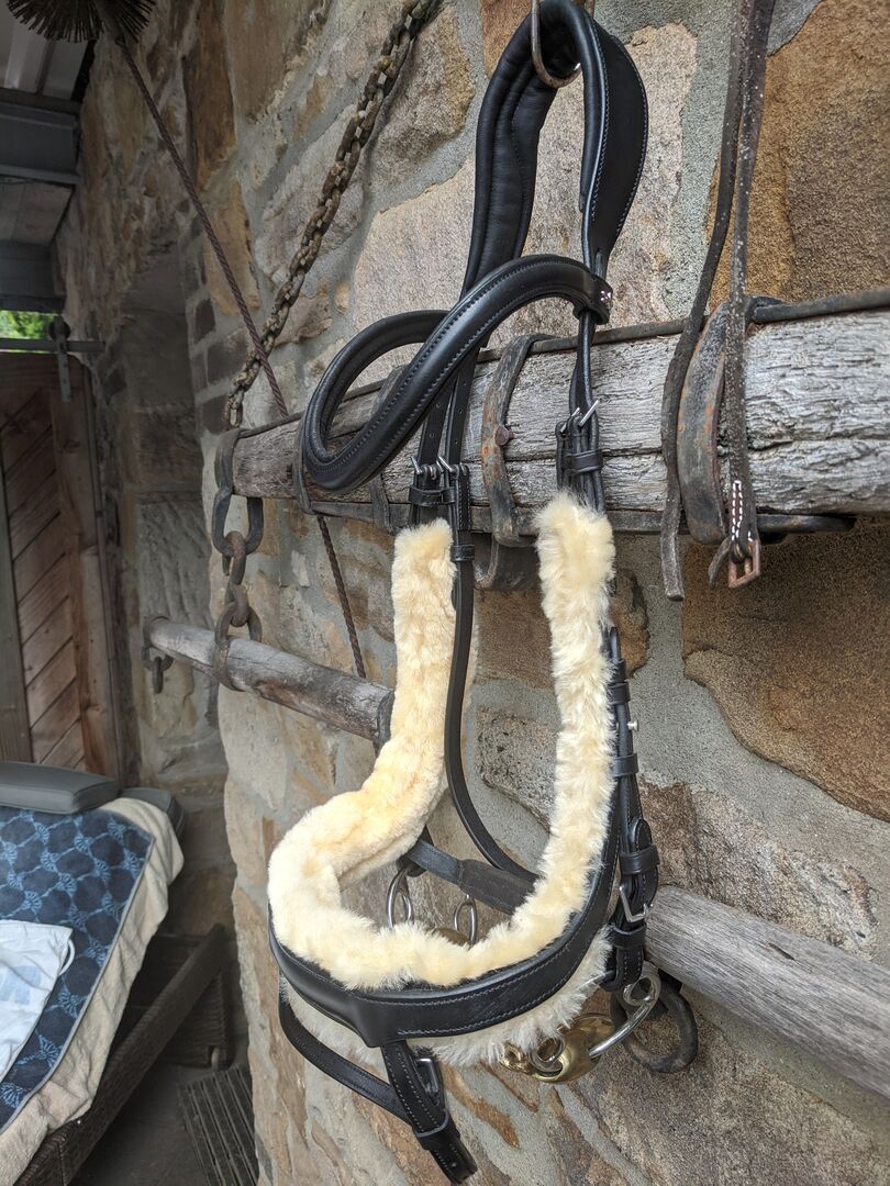 Neue und unbenutzte Trense mit Lammfell und Gebiss.