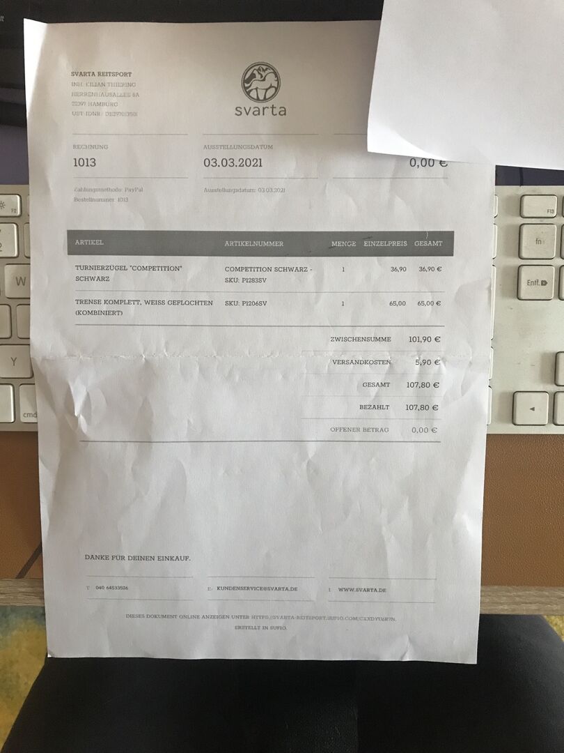 Hallo, Ich verkaufe eine fast neue Trense mit Tunierzügeln. Wie auf dem Kaufvertrag zusehen ist, haben wir dieses Komplett-Set( ohne Gebiss) erst im März 2021 erworben. Die Trense wird ohne Gebiss verkauft. Leider passt sie nicht optimal für meine Tinkerstute.
