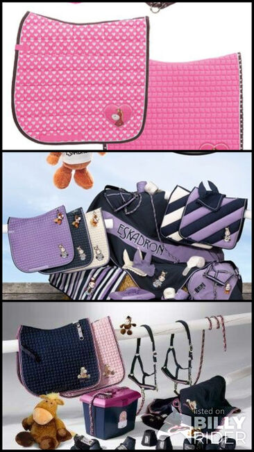 Trockene Schabrackenfäden Herzen, violett&marine - Hallo, ich möchte die abgebildeten Satteldecken in Größe VS oder eventuell PVS kaufen. Ich suche eine Satteldecke aus Nici Eskadrons Kollektion "Hearts Pad and Cotton Pink 2016". Die zweite Decke ist violett, aber auch andere Farben aus Baumwollgarnen von 2010 wären in Ordnung. Marineblaue Garne aus den Jahren 2006 und 2004 wären ebenfalls toll. Ich bin offen für andere Angebote.