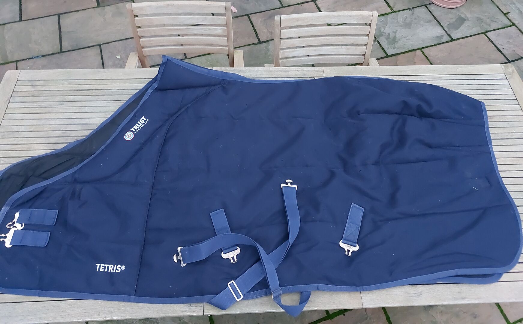 Gut erhaltene Stalldecke, 400 gr. Toller Widerristschutz. Sitzt super, alle Strippen noch vorhanden. Den Brustverschluss hab ich verstärkt.
