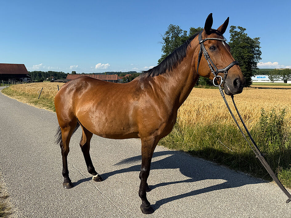 Roxy (geb. 2012) ist eine liebevollle Warmblutstute, die Bewegung liebt und zuverlässig unter dem Sattel geht.