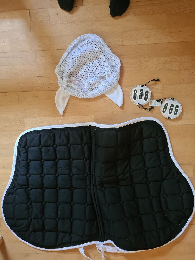 Die Tuniersachen sind erst einmal auf meinem Warmblut gelegen und sind quasi neuwertig. Die Startnummern sind ausgepackt, aber unbenutzt.