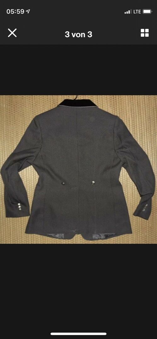 Farbe: dgrau, mit Samtkragen in schwarz, silberner Biese an Kragen + Taschen, silberfarbene Knöpfe, dgraues Innenfutter