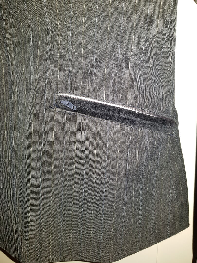 Farbe: dunkelgrau mit hellgrauen/ silbernen Nadelstreifen & Details