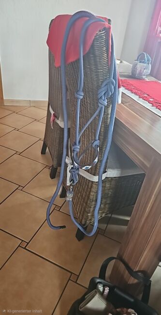 Knotenhalfter von Stonedeek mit doppeltem Genickstück und doppeltem Nasenriemen, der mit haltbaren Perlen in einem tollen Muster besetzt ist. War nur einmal zur Anprobe am Pferd. Mit Stonehenge Bodenarbeitsseil Barrie. In größe pony und in der Farbe Denim.