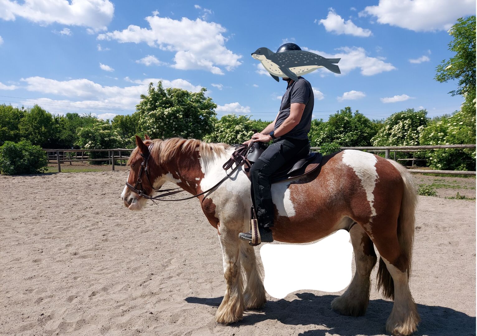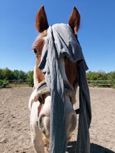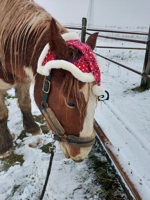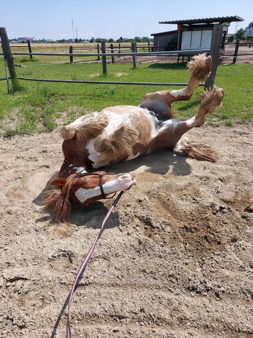Robbie (Rob Roy EG) ist ein im April 2021 geborener Irish Tinker Wallach Gewicht und Stockmaß wurden im Frühsommer 2025 gemessen und lagen bei 553,5kg & 148cm Momentan lebt er in einer Wallachherde in einem Offen/Aktiv Stall, mit automatischer Heufütterung, was ihm sehr gut tut. Vor dem Umzug in den jetzigen Stall stand er auch in einer gemischten Offenstall-Herde wo er sich problemlos eingefügt hatte. Sein Rang ist mittelhoch, er lässt sich nicht gerne verdrängen, scheucht aber auch niemanden weg, einfach der chillige Typ. Hauptsächlich haben wir ihn in allen Gangarten mit oder ohne Sattel longiert, Stangenarbeit, Bodenarbeit und Clickertraining gemacht. Er ist noch im Wachstum und daher nur vorsichtig angeritten, hauptsächlich im Schritt. Das aber sowohl am Reitplatz, in der Halle als auch im Gelände. 2025 wurde ihm ein D&P Quantum Western Sattel in Westernoptik maßangepasst, Zaumzeug mit und ohne Gebiss (hauptsächlich ohne geritten), Barebackpad und anderes Equipment ist ebenfalls vorhanden und wird Robbie mitgegeben.
