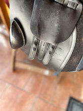 Der Sattel ist in einem sehr guten, gebrauchten Zustand. Er bietet eine tolle Kammerfreiheit und lag auf einem Pferd mit relativ hohem und langem Widerrist. Die vorderen Pauschen sind mit Klett versehen und können beliebig versetzt werden. Die hinteren Pauschen können abgenommen werden, sodass der Sattel auch als reiner