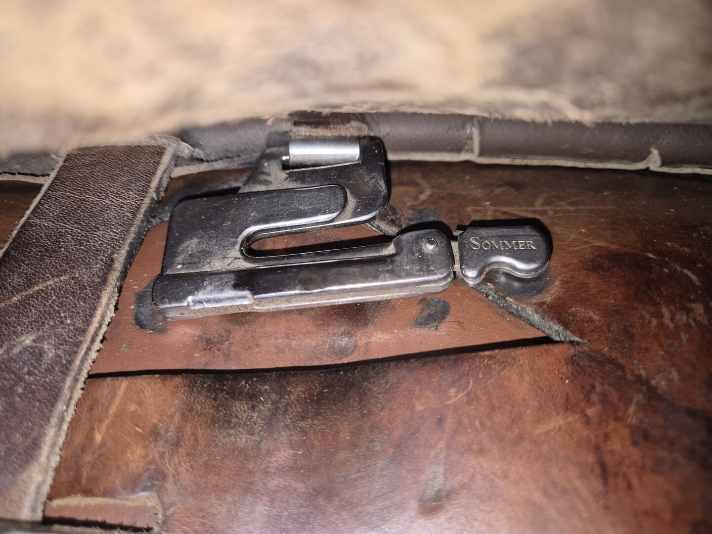 Die Pauschen können an verschiedenen Positionen angeschraubt werden. Der Sattel kann auch prima ohne Pauschen und ohne Sattelblatt geritten werden. Für Gepäck hat man genug Schrauben und Ösen zur Verfügung. Auf dem einen Foto sieht man ein Loch. Hier fehlt nichts sondern hier kann der Sattel leicht an das Pferd angepasst werden, einfach die Schrauben versetzen. Die Strupfen habe ich etwas gekürzt, da sie viel zu lang waren. Das Rot auf den Panels kommt von einer roten Filzschabracke, die ich darunter verwendet habe. Über dem Sattel hatte ich eine Fellauflage zur Schonung und ich trage keine Silikonreithosen, die das Leder schädigen